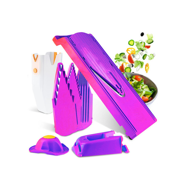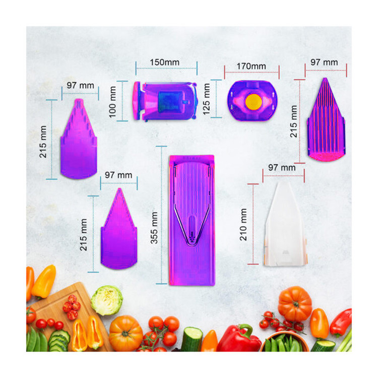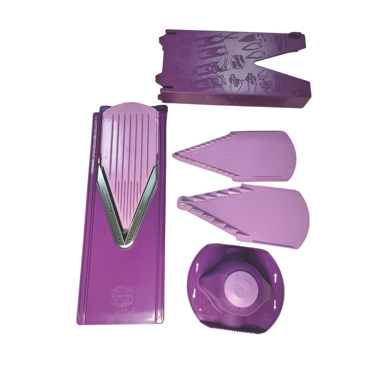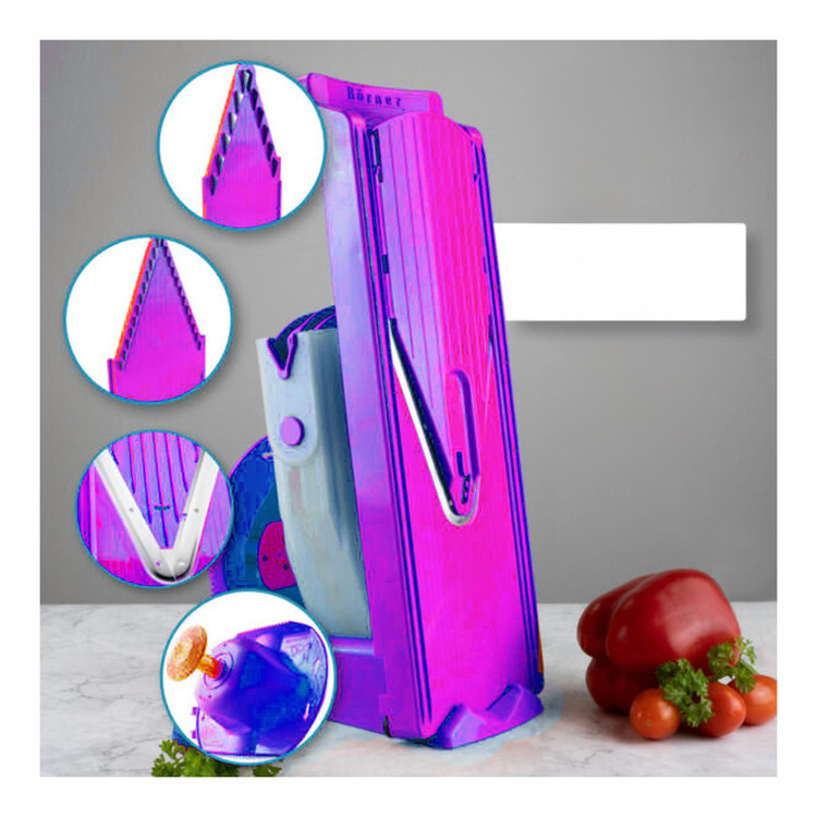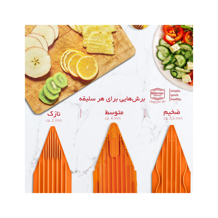 رندهی بورنر V3 ترنِدلاین – پرو سِت رندهی بورنر V3 ترنِدلاین پرو سِت با طراحی جذاب خود تمام احتیاجات یک آشپز را برآورده میکند. این مجموعهی هشت تکه فضای بسیاری کمی در آشپزخانهی شما اشغال میکند. پایهی نگهدارندهی داخل این محصول مکان مناسبی برای جاگذاری رنده، کلاهک ایمنی و جعبهی نگهدارندهی دو عدد سررنده میباشد و امکان نگهداری این محصول در کوچکترین آشپزخانهها را نیز فراهم میکند. با سررندههای 5/3 و 7 میلیمتری میتوانید میوهها و سبزیجات خود را به صورت خلالها و نوارهای نازک و ضخیم برش بزنید. رندهی v3 برای قطعه قطعه کردن سیبزمینی و پیاز بسیار مناسب است. برای ایجاد برشهای نگینی کردن ابتدا چند برش صاف ایجاد کنید و سپس کلاهک ایمنی را 90 درجه بچرخانید تا به نتیجهی مطلوب برسید. با استفاده از سررندهی ورقه کردن میتوانید به میوهها و صیفیجات خود را به صورت نازک و ضخیم ورقه کنید. با استفاده از کلاهک ایمنی از انگشتان خود در برابر تیغههای تیز بورنر محافظت کنید. این کلاهک در تمام رندهها و خردکن های بورنر سری V قابل استفاده میباشد. با این محصول میتوانید میوهها و سبزیجات خود را با کمترین ضایعات خرد کنید. داخل بستهبندی محصول یک عدد زبانهی ایمنی نیز وجود دارد. همیشه پس از استفاده از محصول این زبانه را در محل خود قرار دهید تا با محافظت از تیغهها خطر آسیبدیدگی کاهش پیدا کند.