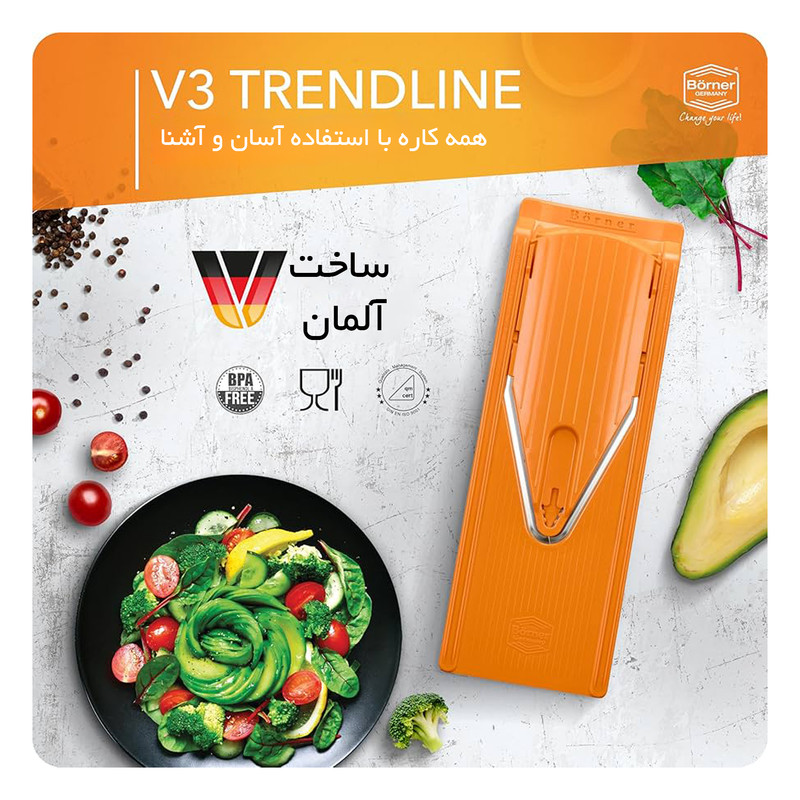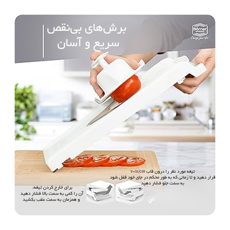 رندهی بورنر V3 ترنِدلاین – پرو سِت رندهی بورنر V3 ترنِدلاین پرو سِت با طراحی جذاب خود تمام احتیاجات یک آشپز را برآورده میکند. این مجموعهی هشت تکه فضای بسیاری کمی در آشپزخانهی شما اشغال میکند. پایهی نگهدارندهی داخل این محصول مکان مناسبی برای جاگذاری رنده، کلاهک ایمنی و جعبهی نگهدارندهی دو عدد سررنده میباشد و امکان نگهداری این محصول در کوچکترین آشپزخانهها را نیز فراهم میکند. با سررندههای 5/3 و 7 میلیمتری میتوانید میوهها و سبزیجات خود را به صورت خلالها و نوارهای نازک و ضخیم برش بزنید. رندهی v3 برای قطعه قطعه کردن سیبزمینی و پیاز بسیار مناسب است. برای ایجاد برشهای نگینی کردن ابتدا چند برش صاف ایجاد کنید و سپس کلاهک ایمنی را 90 درجه بچرخانید تا به نتیجهی مطلوب برسید. با استفاده از سررندهی ورقه کردن میتوانید به میوهها و صیفیجات خود را به صورت نازک و ضخیم ورقه کنید. با استفاده از کلاهک ایمنی از انگشتان خود در برابر تیغههای تیز بورنر محافظت کنید. این کلاهک در تمام رندهها و خردکن های بورنر سری V قابل استفاده میباشد. با این محصول میتوانید میوهها و سبزیجات خود را با کمترین ضایعات خرد کنید. داخل بستهبندی محصول یک عدد زبانهی ایمنی نیز وجود دارد. همیشه پس از استفاده از محصول این زبانه را در محل خود قرار دهید تا با محافظت از تیغهها خطر آسیبدیدگی کاهش پیدا کند.